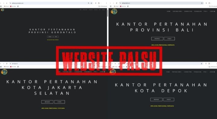 Menurutnya, telah ditemukan sejumlah situs palsu yang meniru tampilan portal resmi milik Satker ATR/BPN. Situs tersebut menduplikasi konten dan desain laman resmi, sehingga berpotensi menyesatkan masyarakat.