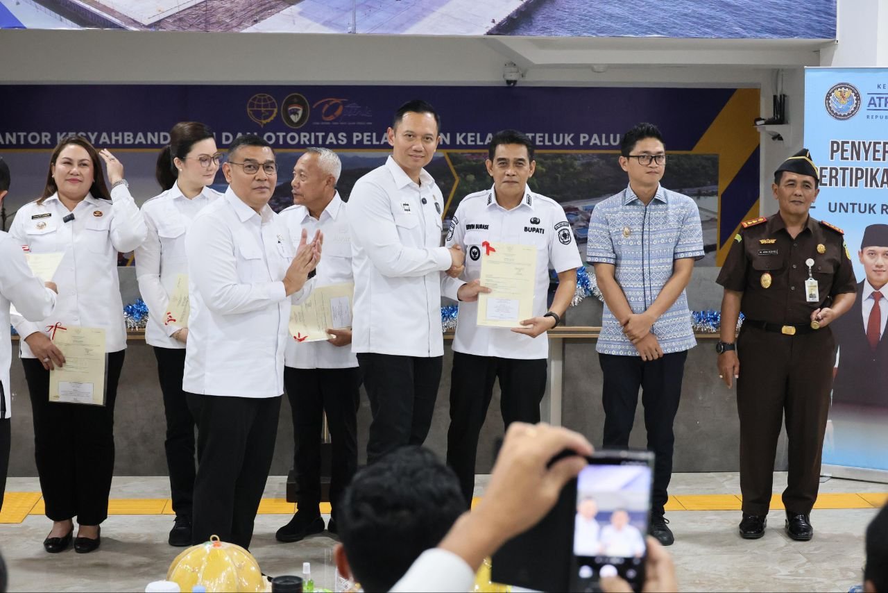 Penyerahan dilakukan secara simbolis di Terminal Penumpang Pelabuhan Donggala, sebagai bagian dari program strategis nasional Pendaftaran Tanah Sistematis Lengkap (PTSL) yang bertujuan menghadirkan keadilan agraria dan memperkuat perlindungan hukum atas tanah.