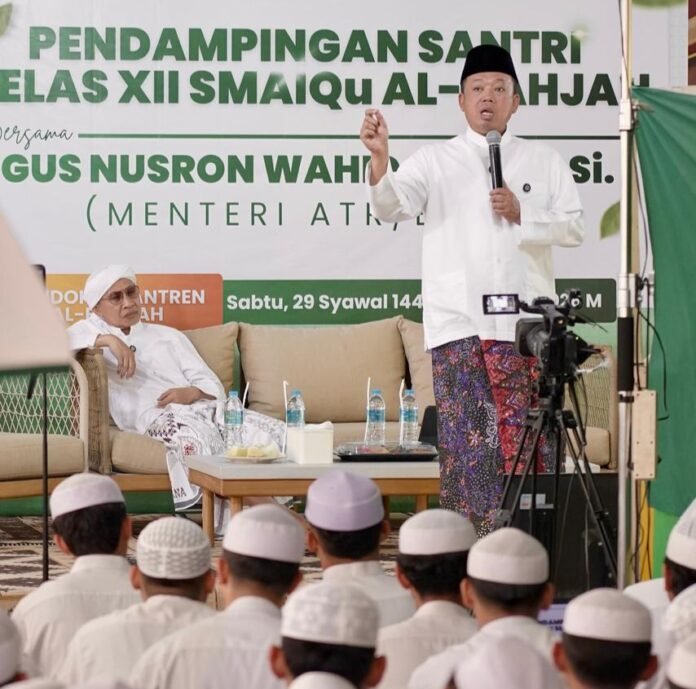 LAMANINDO.COM, CIREBON – Nusron Wahid mendorong kalangan santri untuk mengambil peran strategis dalam pembangunan bangsa melalui penguasaan ilmu pengetahuan dan teknologi. Hal itu disampaikannya saat memberikan motivasi kepada santri kelas XII SMA Islam Qur’an di Pondok Pesantren Al-Bahjah, Cirebon, Sabtu (18/04/2026).